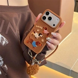 case iphone 17 16 15 14 promax pro leather suede emboidery puppy soft full cover strap tali handle